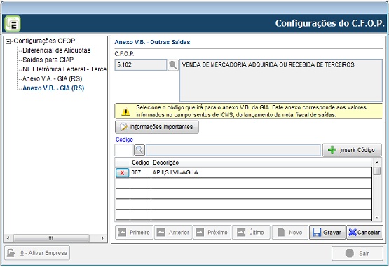 Obs. Pode ser utilizado mais de um Código para o mesmo CFOP.