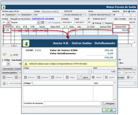 No lançamento da nota fiscal de Saída, depois de informar o valor do campo Isentos de ICMS será habilitada a tela:
